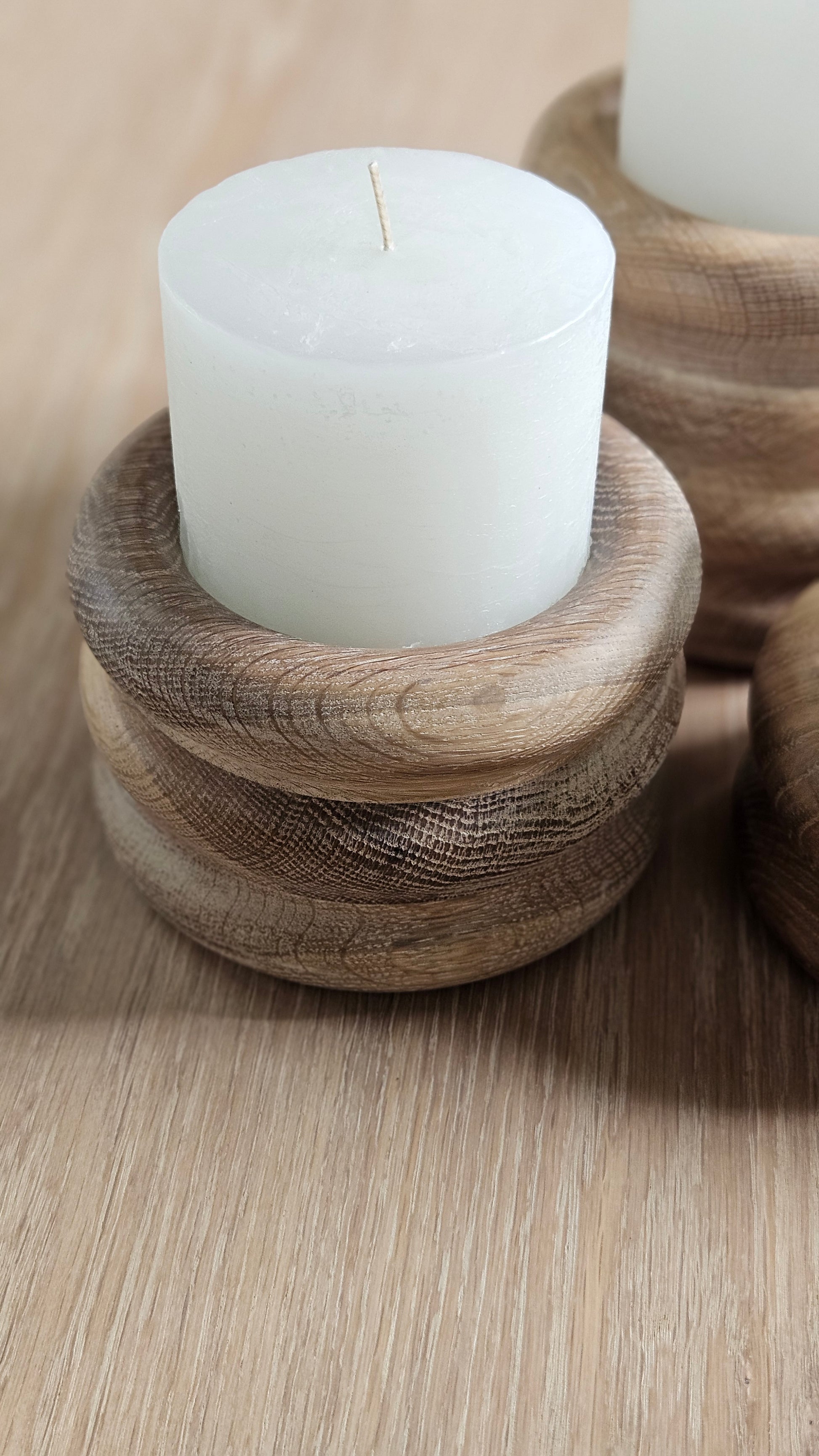 Each holder is shaped out of European oak, turned and sculpted into gentle, flowing rings that cradle standard 10 cm pillar candles. The three varying heights create a quiet, natural rhythm on any table or shelf.